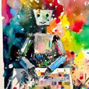 DALL·E 2023-06-29 10.53.10 – watercolor of a robot creating art, vibrant colors in background should look psychadellic